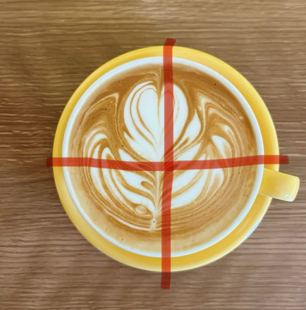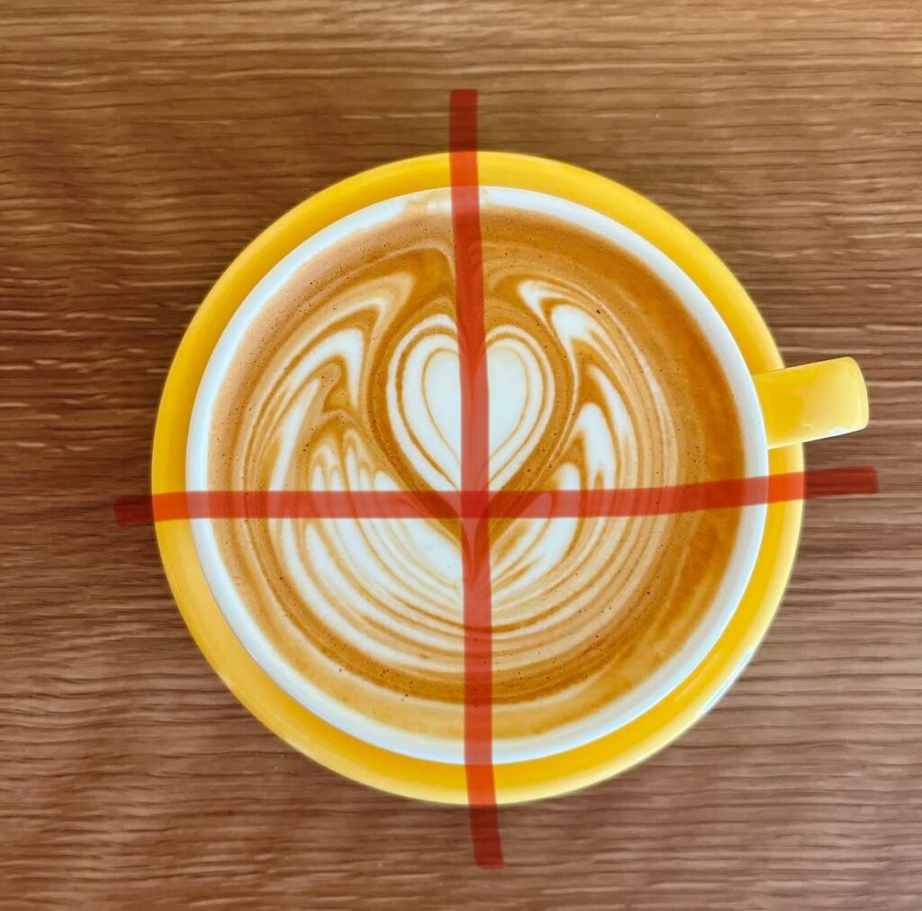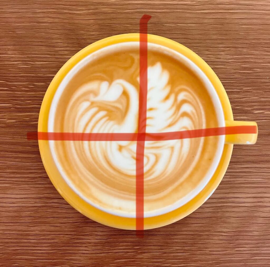 ラテアートを注いだあと、真上から見て絵柄と持ち手の位置がズレてないかを確認してみて下さい。